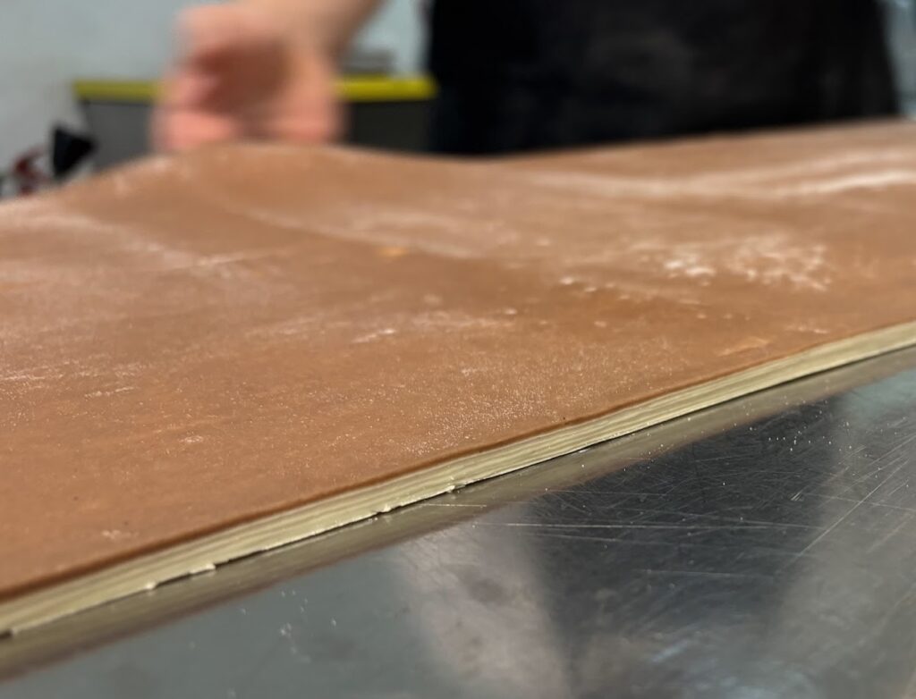 Sfogliare dando una piega da 3 e una da 4 (tenere sempre una temperatura fredda).