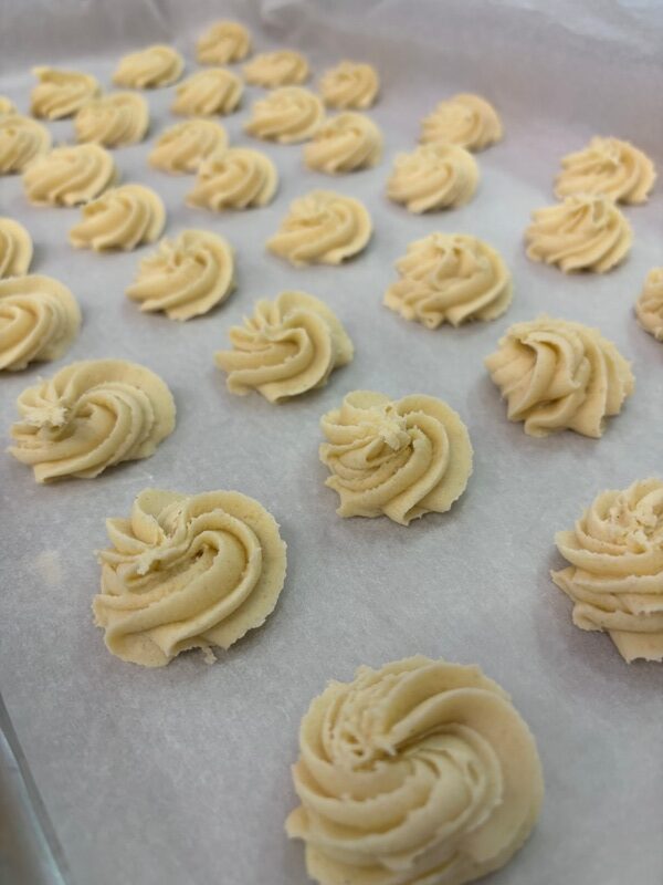amalgamare il burro a temperatura ambiente con lo zucchero utilizzando la foglia, fino ad ottenere una crema, quando è ben amalgamato, aggiungere la vaniglia, sale e le uova appena strapazzate poco per volta, incorporare la farina e procedere per le forme dei biscotti in teglia con una sac-a-poche.