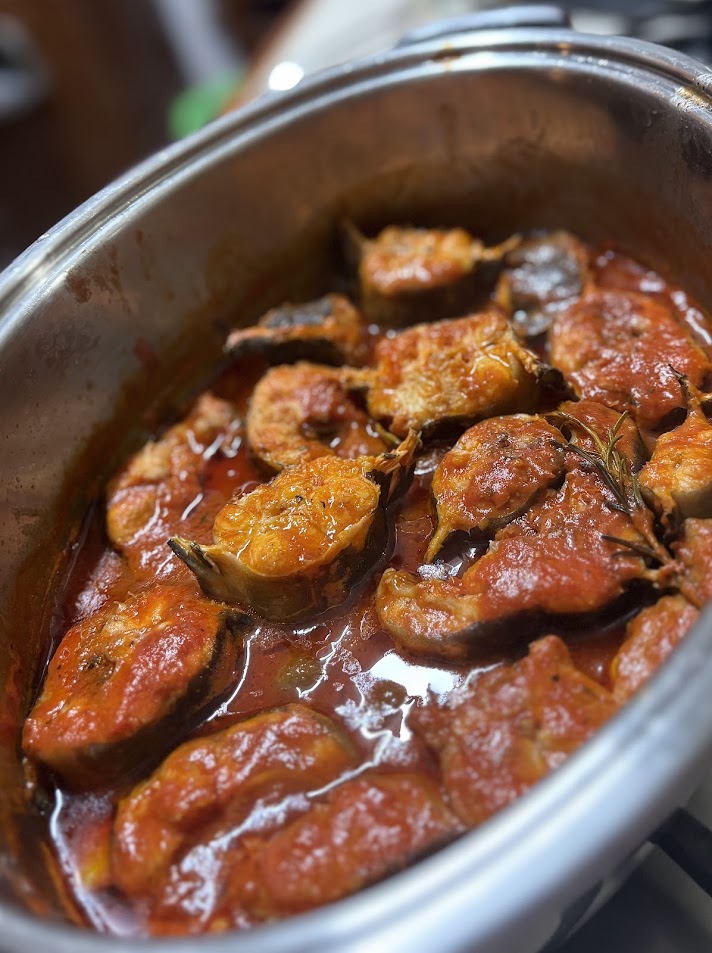 Mettere i tranci di gronco a fiamma altata nel fondo, fare rosolare e bagnare con vino bianco.
