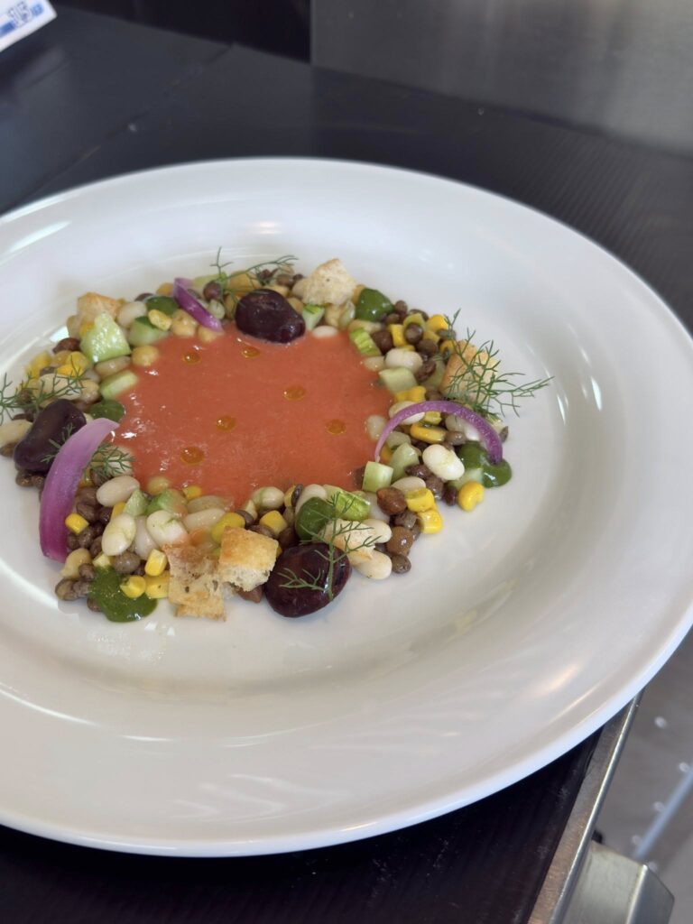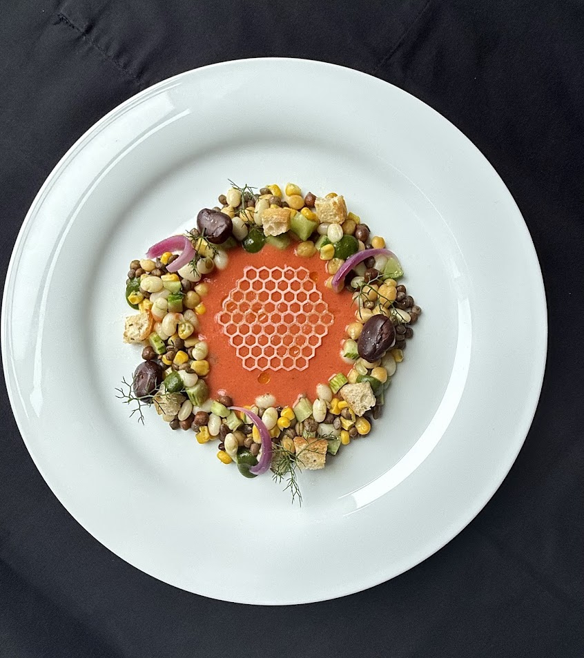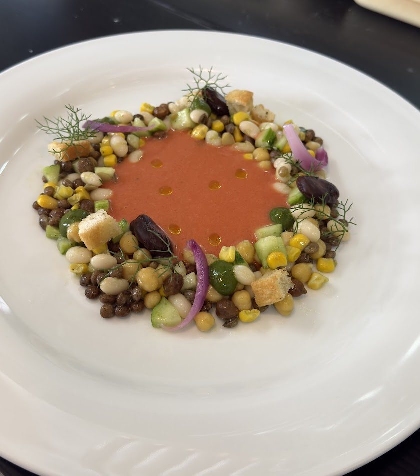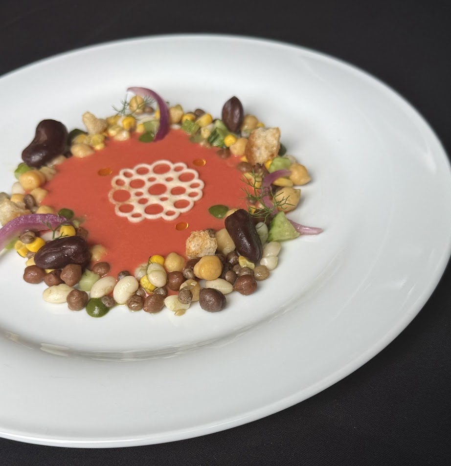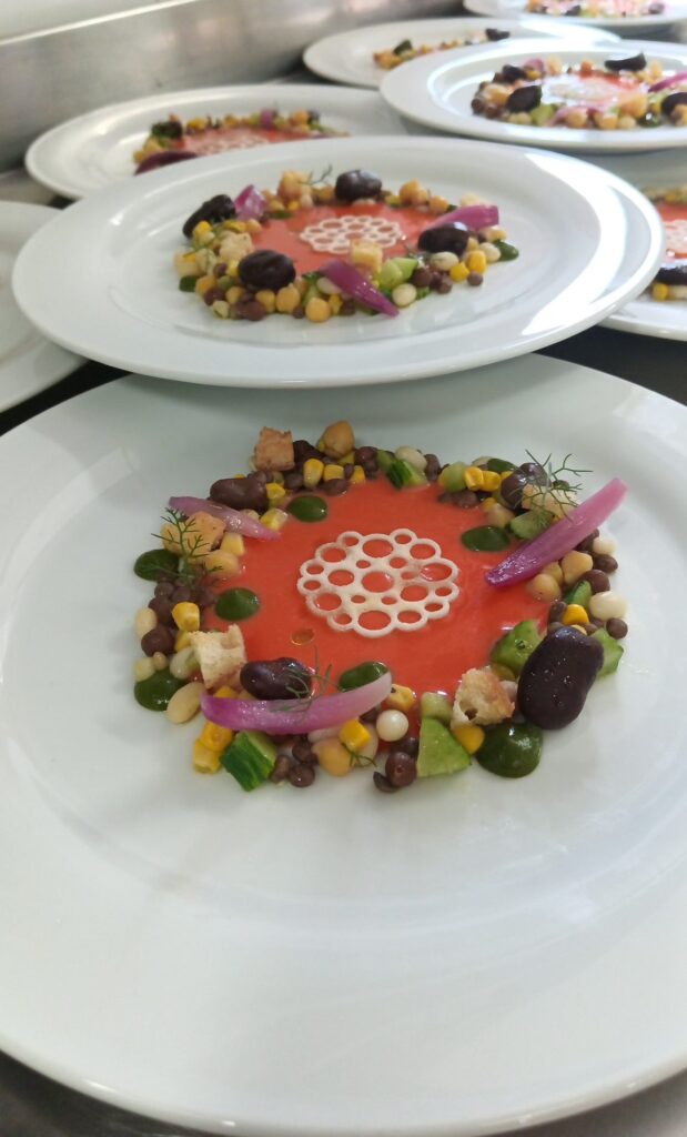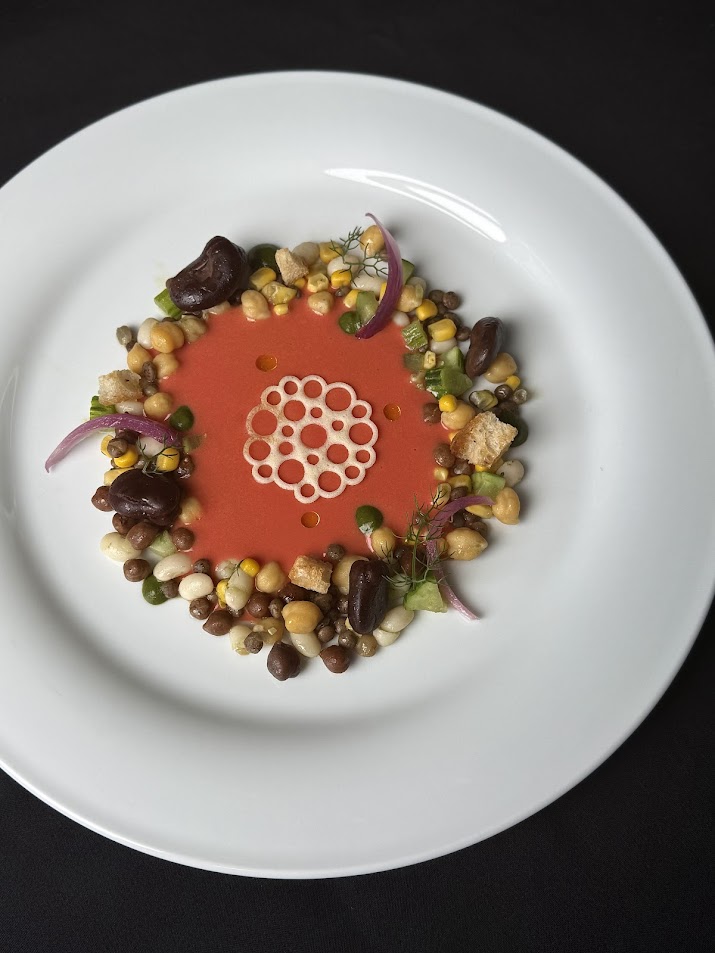 Disporre i legumi nel piatto a forma di corona, al centro versare la salsa di Gazpacho, completare con pane tostato alle cipolle, cialda al pecorino e gel al finocchietto selvatico.