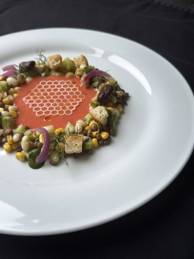 Al centro, una crema di gazpacho filtrata e vellutata dona profondità vegetale e una freschezza mediterranea che avvolge il piatto.