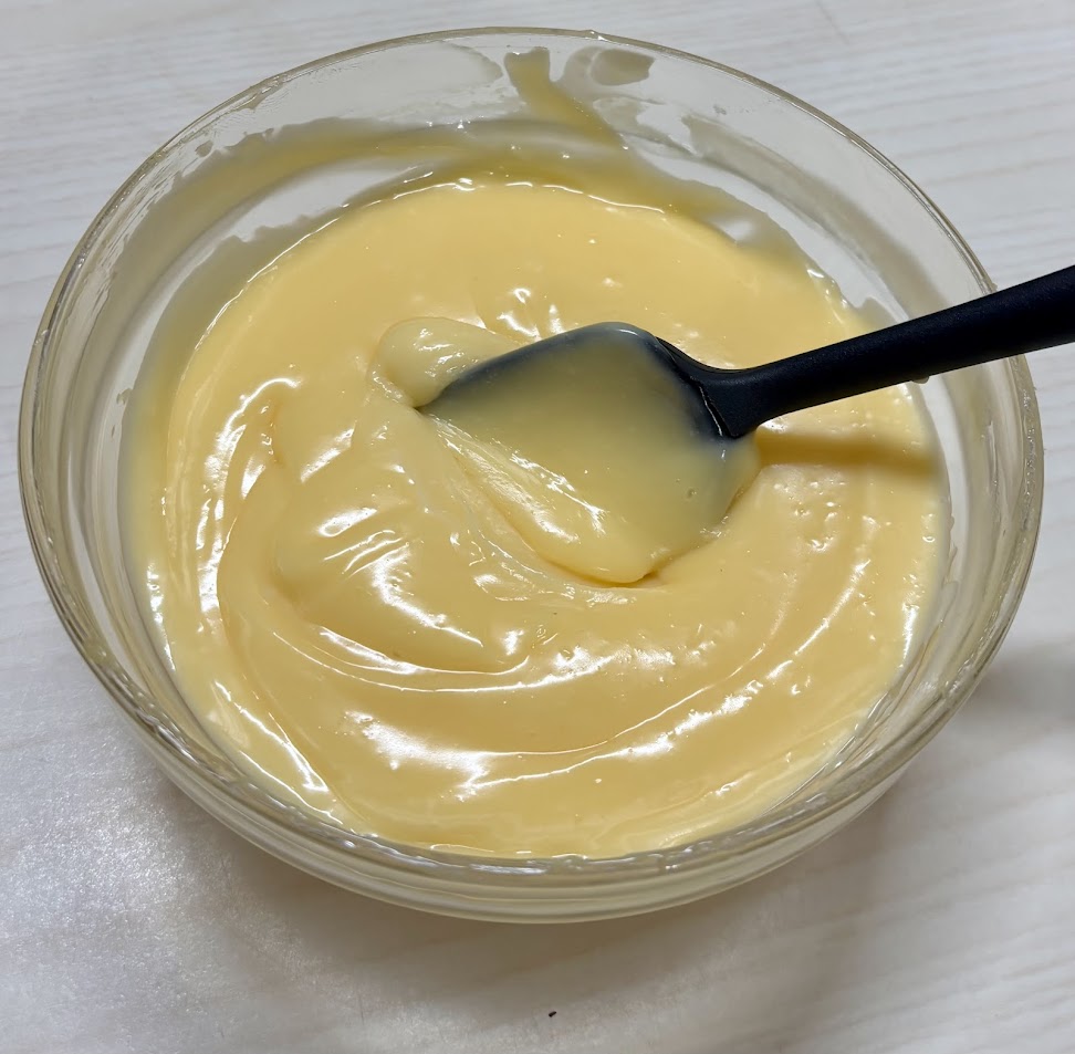 procedere come una crema inglese (mescolare tutti gli ingredienti tranne il burro, portare a sobollore), fuori dal fuoco emulsionare con burro.