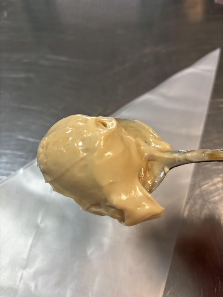 Emulsionare il tutto a velocità minima, quando la maionese è bella emulsionata, incorporare la pasta di nocciole.