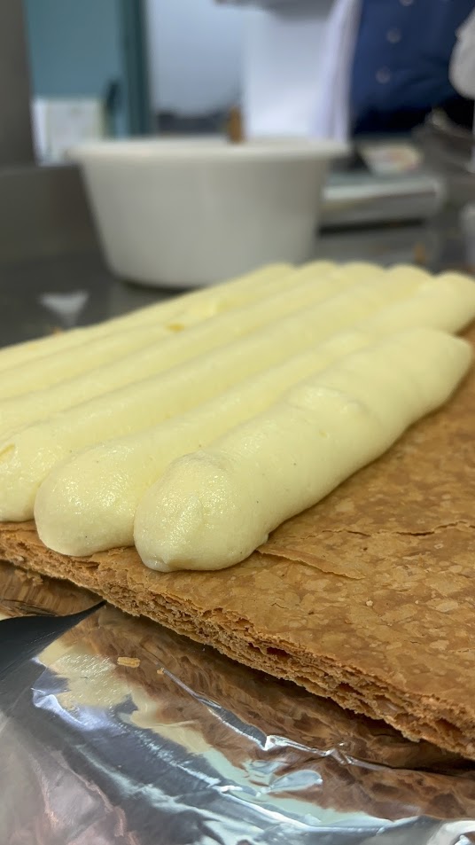 Disporre uno strato di sfoglia, aggiungere la crema e completare con un altro strato di sfoglia.
