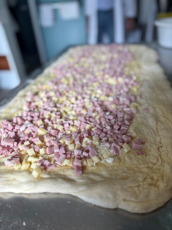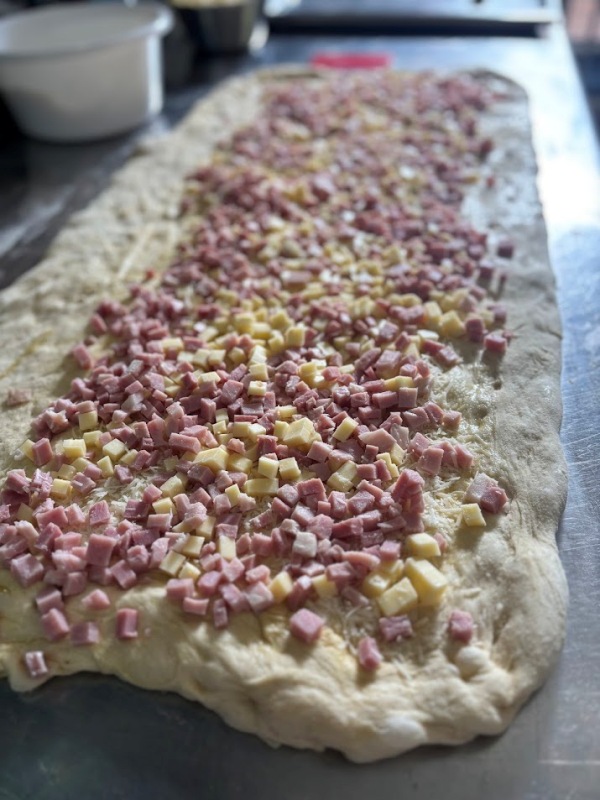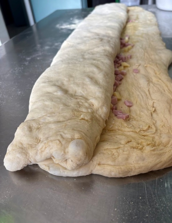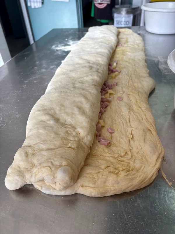 Stendete l’impasto sul tavolo a forma di rettangolo, farcire con i salumi, arrotolare e tagliare a tranci di 4/5cm.