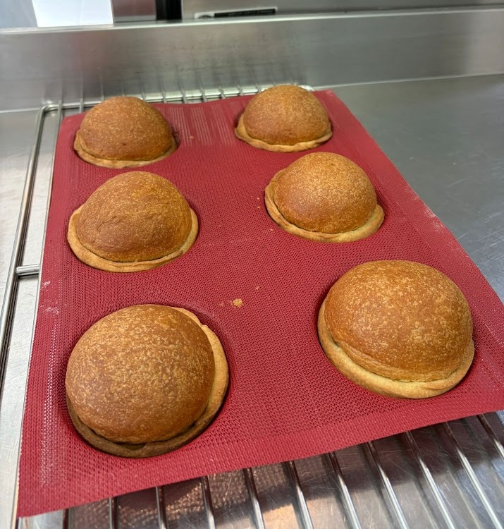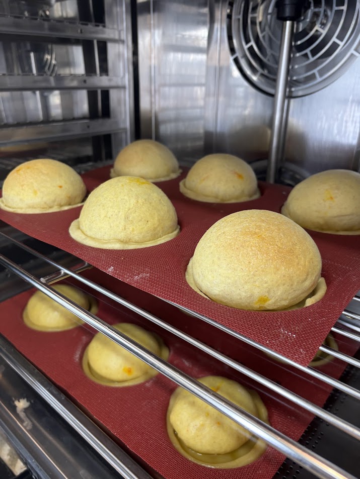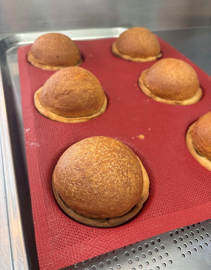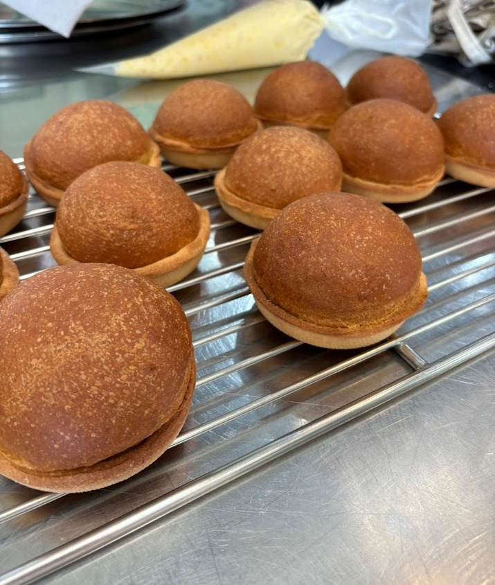 L’assemblaggio è un gesto che unisce tecnica e simbolo: la sfera di brioche posata sulla frolla richiama la forma originaria della pardula, ma la trasforma in un piccolo lievitato da forno. La cottura lenta permette allo zafferano di sprigionare il suo colore caldo e alla brioche di sviluppare una doratura uniforme. Solo alla fine, quando la struttura è stabile, la farcia viene siringata al centro, come un omaggio al cuore del dolce tradizionale.