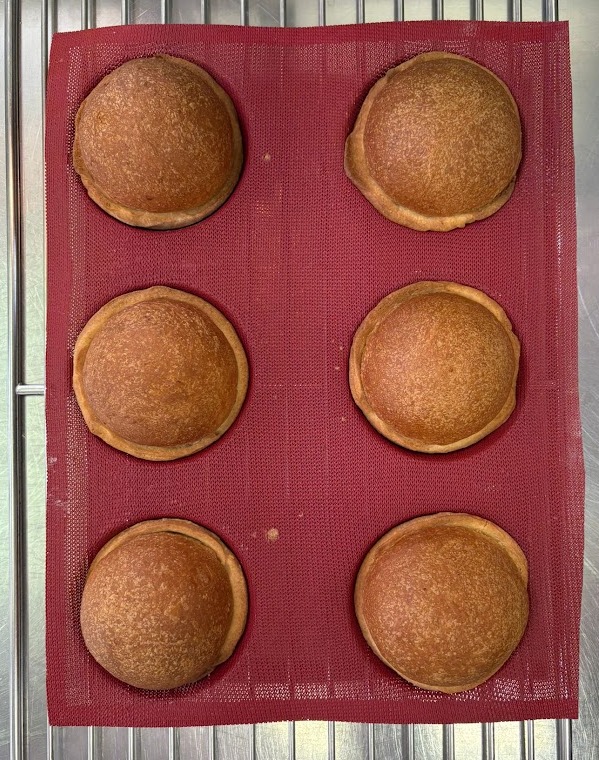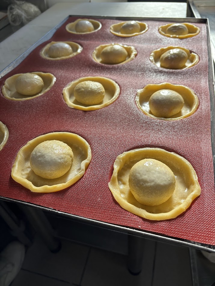 Stendere la frolla negli stampi, adagiare le sfere, fare lievitare ed infornare a 160°C a convenzione per 35/40min.