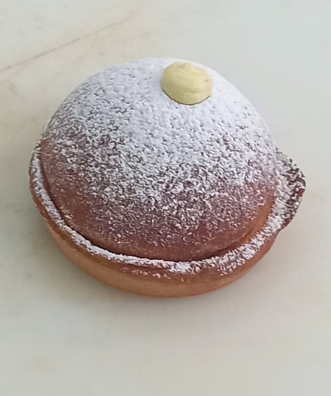 La farcia, invece, rimane fedele alla tradizione: ricotta di pecora, zucchero a velo, zafferano e arancia candita. È una crema che conserva il carattere autentico della pardula, ma che, inserita in un contesto lievitato, acquista una nuova centralità. Diventa un cuore morbido che contrasta con la leggerezza della brioche e con la friabilità della frolla Milano che fa da base. Questa tripla consistenza — croccante, soffice, cremosa — è la firma della reinterpretazione.