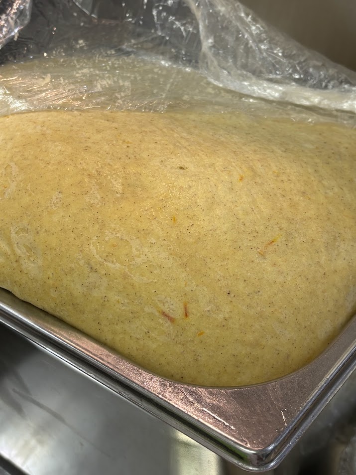 L’impasto brioche è il primo elemento di innovazione. Una farina forte, una lievitazione lunga, il profumo dello zafferano sciolto nel latte e quello dell’arancia che aromatizza il burro: tutti dettagli che trasformano la base tradizionale in una massa soffice, elastica, ricca. È un impasto che richiede tempo, attenzione, rispetto delle temperature e della maturazione. La notte in frigorifero non è una pausa, ma una fase fondamentale per sviluppare aromi e struttura.