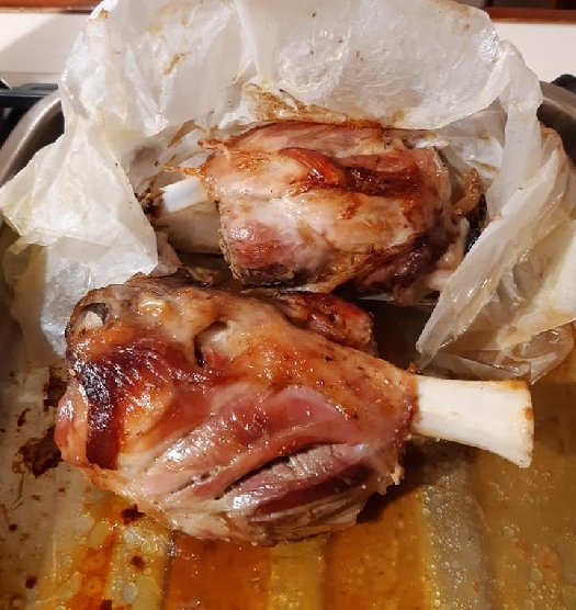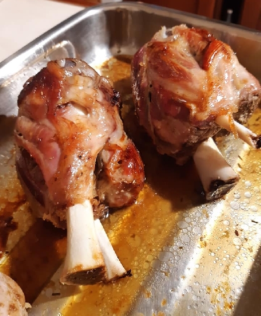Uno stinco di maiale massaggiato con olio e sale rosa, avvolto nel suo cartoccio di carta da forno e lasciato cuocere dolcemente per ore, fino a diventare tenero e succoso. Le erbette — rosmarino, salvia, ginepro e origano — sprigionano aromi profondi che penetrano nella carne senza sovrastarla. La doratura finale a forno vivo crea una crosta fragrante che contrasta con la morbidezza interna. Un piatto rustico e accogliente, perfetto con un contorno caldo che ne esalti la semplicità