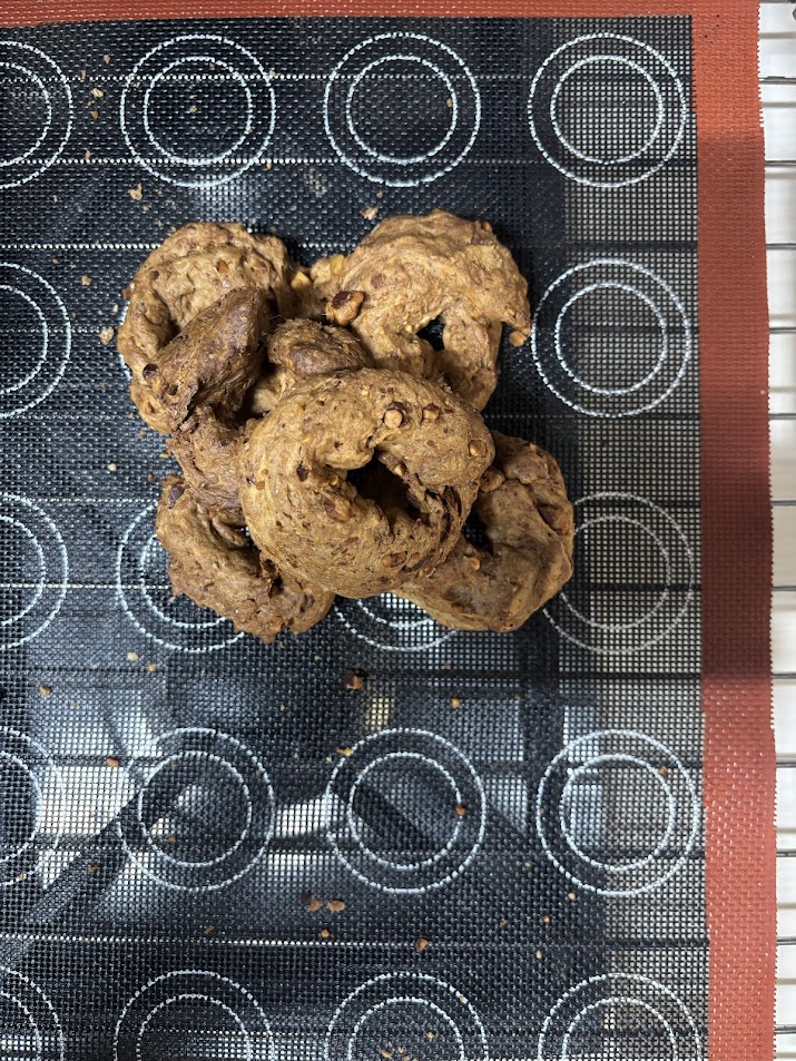 Formare dei filoni da 70gr. ciascuno lunghezza 70cm, unite due filoni e creare un torcione avvolto su se stesso, volendo inserite anche due/tre mandorle umide intere su ogni tarallo.