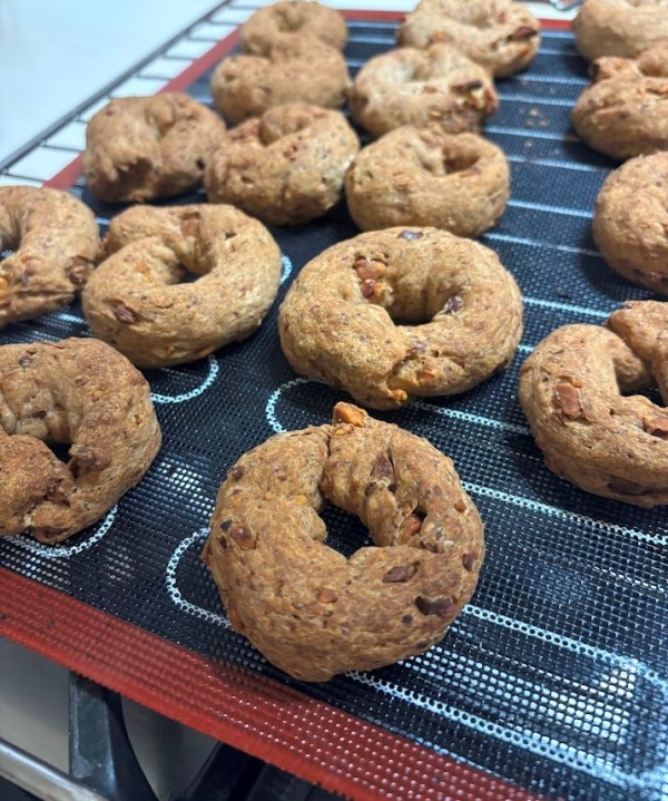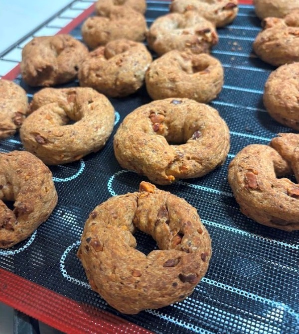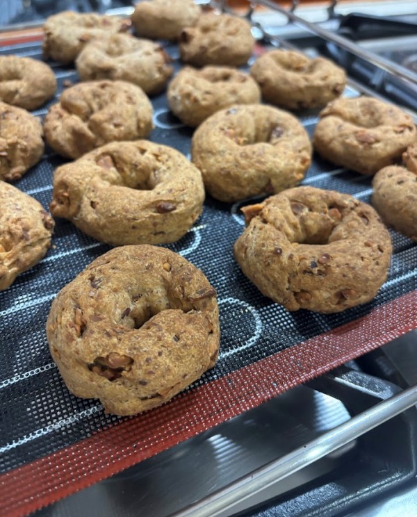 Formare dei filoni da 70gr. ciascuno lunghezza 70cm, unite due filoni e creare un torcione avvolto su se stesso, volendo inserite anche due/tre mandorle umide intere su ogni tarallo.